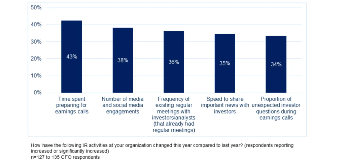 A survey of 146 CFOs found that 35% or more of respondents reported an increase in the volume, frequency and time sensitivity of investor communications and engagements in 2025 compared with 2024. Gartner conducted the survey from October through December 2025.